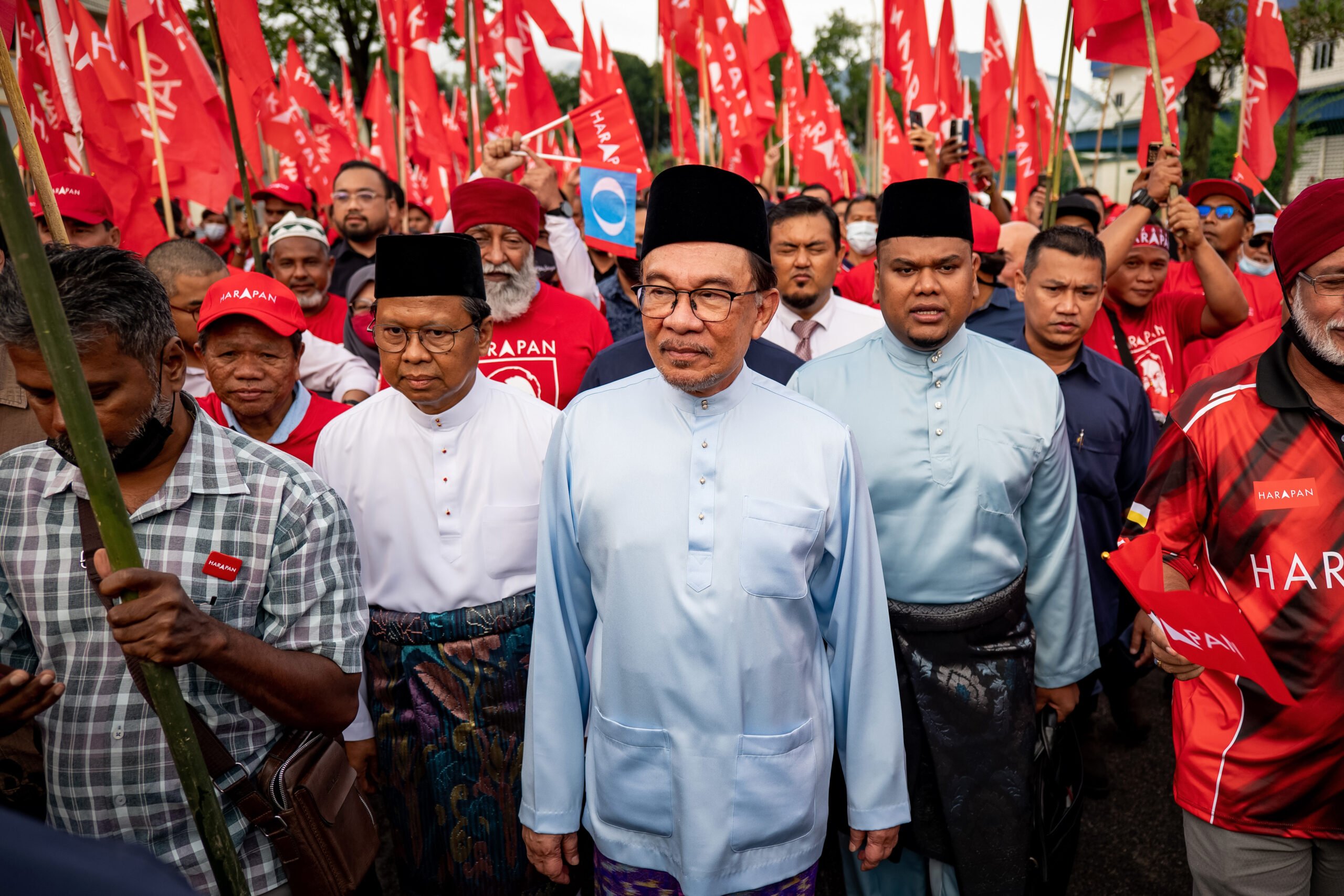 TAMBUN, MALAYSIA – NOVEMBER 05: Malaysia’s opposition leader Anwar Ibrahim, also the leader of the Pakatan Harapan (Alliance Of Hope) coalition, greets supporters as he arrives to submit his nomination as a candidate on November 05, 2022 in Tambun, Perak, Malaysia. Malaysia will hold its 15th general election this month. (Photo by Sadiq Asyraf/Getty Images)